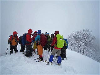 2度目のラッセルが廻ってこないうちに、11時40分ごろ頂上に着きました。その頃には、雪もやや激しくなり、昼食は下ってからということになりました。リーダーの心の中の山並み、粟ヶ岳、正面が権ノ神岳、宝蔵山、奥に白山とガスの向こうの山々を思い描いて記念写真撮影、すぐに下山。 |