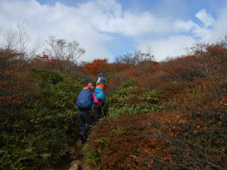 ブナ林を過ぎて森林限界に達すると視界が開け、周囲の山肌が色付き始めていました。
