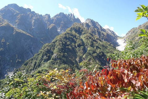 仙人と池之平周辺の紅葉と、左から白馬・白馬鑓・天狗の頭・唐松・白岳・五竜・鹿島と続く絶景を堪能