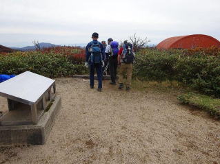 5合目でも休憩、いつ来ても思うのですが此処から6合目迄長く感じられます。多人数ですので油こぼしで渋滞、会の女性2人に追いつかれます。 8合目のお花畑は今は草紅葉で綺麗です。此処より山頂の避難小屋も見えます。赤色の紅葉は少ないですが黄色の紅葉の中を歩き琵琶池も過ぎ山頂に着きました。
