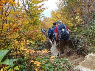 3合目で休憩、紅葉も見頃なので次々と登山者が登ってきます。その中には知り合いも何人か居ました。4合目で休憩、ブナ林が綺麗です。 |