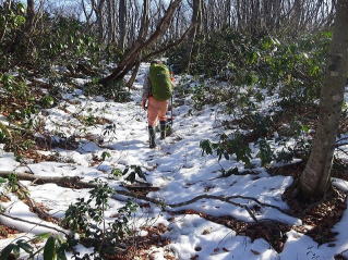 私らも下山は周回コースで風越尾根への分岐を過ぎ藪っぽい急な下りを滑らないように気を付け福連寺山を目指します。