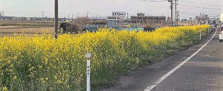 車窓からは道路脇の黄色の絨毯が鮮やか、菜の花ロードが続く。