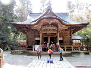 駐車場を出ると神社の赤い鳥居が目の前に、その先には見上げる階段「今日、一番のキツイ上りです」リーダーの声がする。上りきると広い境内に神社、そして神楽殿が。
