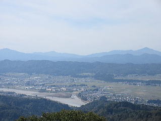 擬木の階段を隠すほど濃いヤブの急坂を登り、振り返れば小千谷市街と蛇行する信濃川が、その奥に刈羽三山や遠く妙高連山から苗場山まで見渡せました。 |
