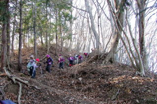 登山口から深い樹林帯の中の急斜面を真っ直ぐ登って行く、やがて九十九折りの急斜面を登りきると、男坂、女坂の標柱があり、我々は当然のように女坂を進んだ。 |