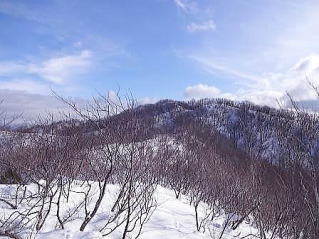雪は少ないです。通常であれば山葵山の山頂部は雪で覆われて禿げ頭の如くになっています。もし、通常の冬尾根ルートを登っていたら藪が多くてかなり苦労していたと思います。 |