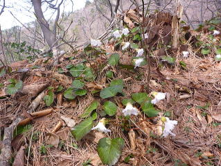 急ではないが、それなりの上り具合、枯葉を踏み歩を進めます。何とイワウチワの花、今年初めてです。ピンクの花びらがとても可愛い!! 沢山咲いています。一旦、林道に出て再び登山道に戻りましたが、イワウチワロードは途切れません。山頂近くまでイワウチワの可憐な花がお供をしてくれました。 |