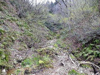 砂防ダムからは谷間を歩きます。砂防ダムから少し上がると沢が分岐します。右が本流ですが、鷹取山へのルートは左側の支流に沿って進みます。 |