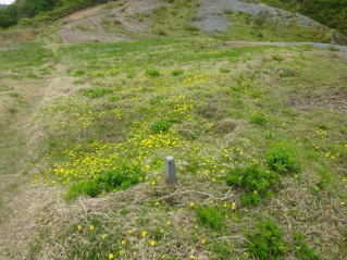 石花集落への分岐を過ぎ樹林帯の登山道にはシラネアオイが咲いて居て天然杉を見ながら歩く所も有ります。又開けた所にはキジムシロの群生が黄色いじゅうたんみたいです。 |
