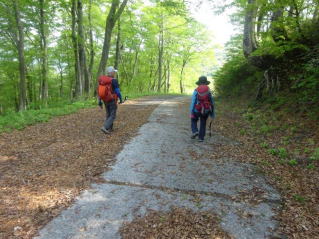 二ノ岳を巻く防衛道路の登がキツイ、でもマツムシ平を過ぎた防衛道路の横にはシラネアオイが群生して居て目を楽しませてくれました。