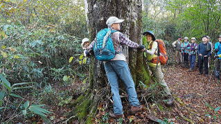 そしてブナの巨木も数多く見られ、登山道脇にある巨木の幹周りを測ってみました。三人が手を繋いでやっとの太さです。