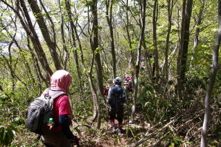 やがて杉林が登山道の右側だけになり新緑の木々が増えだす頃から道は徐々に険しくなり、ループが張ってある箇所が幾度も出てくる。
