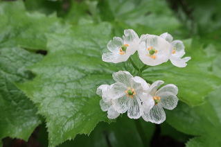 登山道沿いには、鮮やかなピンクのタニウツギ、巨大な葉のエンレイソウの群生、イワカガミの群生など、雨に濡れて生き生きとした植物達がたくさん見られました。ひときわ輝いて見えたのが、今が盛りのサンカヨウ。雨を含んだ透明な花びらに魅せられて、足を止めての写真タイムです。 雨の日にしか見られない透き通るサンカヨウ、初めて見て感動したという方もいました。