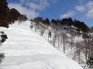 起こる所には木が生えません。まだ雪崩の時期には早そうですが、安全第一、右側の木が茂った所から登ります。ちなみに棚橋山の山頂は