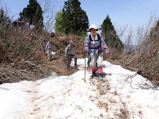 山頂で集合写真を撮り、小城、大城に出発。青い空と芽吹き始めた新緑、タムシバの白い花に色鮮やかなミツバツツジの花、時には残雪歩きと快適な尾根歩きです。雪の残る大城では土塁の上で昼食、360度の展望を楽しみました。一旦山頂に戻り、城坂コースから下山です。 |