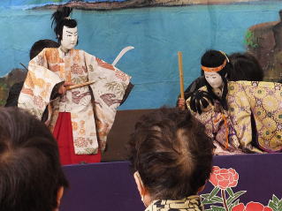 常盤会館にて文弥人形の 鑑賞、『いちよい最後の段』人形の綺麗な衣装に見とれ、悲しい話についほろり。