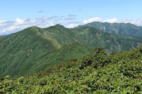 寒江山から左に相模山、大上戸山が見えているようです。この稜線は唯一新潟側から朝日連峰に登るルートで、新潟・山のグレーディングでは超ロングコースのトップにランクされています。