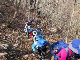 さあ、準備ができたら急斜面をジグザグに登る。あと10分で山頂というところに心配していた氷の塊が現れる。雪解けの水が凍ったものだ。落ち葉が断熱材になってなかなか解けない。長野県では標高1500Mくらいまでは3月中旬に解けてしまうが、ここではまだ残っていた。直径30センチくらいなものが5か所くらい、でもこれを避けて通ればいい。みんなに氷を避けるように指示、みんなに持参してもらった軽アイゼンも帰りにも必要ないだろうと。