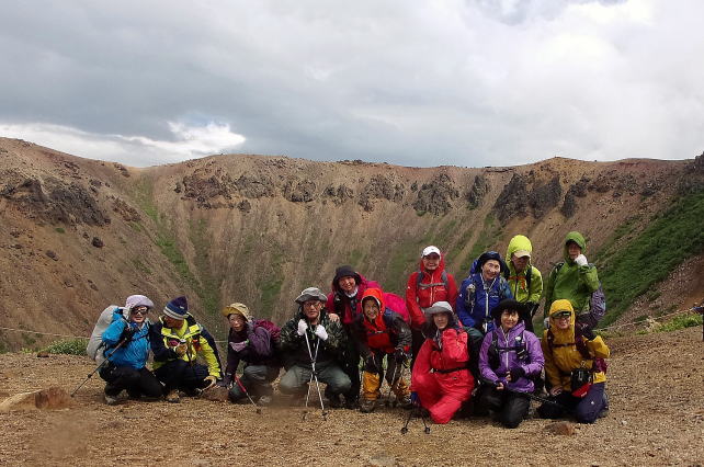 出発前に一切経山噴火口をバックに集中写真 |
