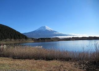 青空に富士山、西側からの富士山は大沢崩れが中央に見ることができ、東側とはまた違う姿を見せてくれる。 |