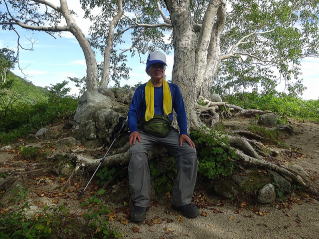 暑さが予想され沢迄の水2,5ℓを持参6度目のザンゲ坂を越え休憩します。汗が吹き出し帽子のひさしからしずくと成って落ちます。