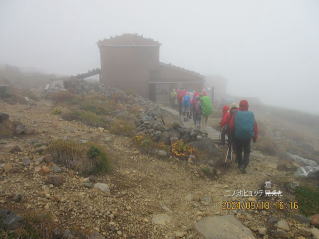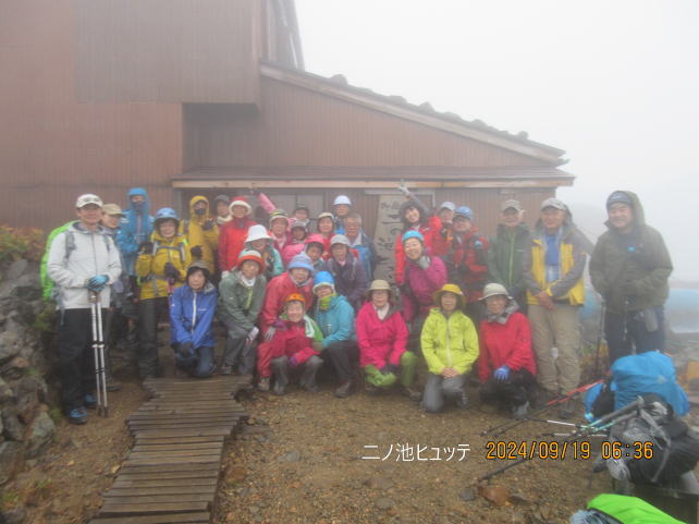 外の風が強くガスも濃いため、山小屋前で集合写真を撮り出発した。
