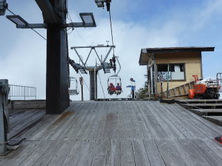 ロープウェイ天元台高原に到着後、歩いてリフト1基目からザックを前にして2人ずつ乗車する。時々止まったりゆっくりになったりしていたので、リフトの管理の方が乗り降りに配慮していることが分かった。