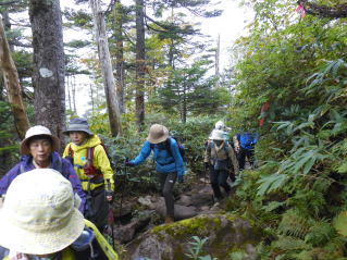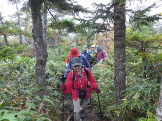 2000mを越える山であるが山頂はオオシラビソの樹木に囲まれていて展望はきかない。山頂が狭いので、個人撮影のみとした。