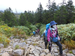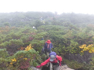 ここから本格的な登山、服装調整をして10:57出発、岩場の急登で大きめの石がゴロゴロあり、登山道は若干濡れていたたが、登り易かった。