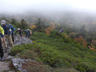 森に囲まれた山頂を10分も下ると途中から木道とまた池塘のある湿原地帯に出会う。そこから来たときと別ルートで天狗岩にある吾妻神社奥の院へ向い、そこで集合写真を撮り、来たコースを戻り北望台へ15:30到着。
