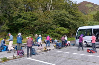 峠の茶屋駐車場で準備(後方茶臼岳)