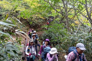 しばらくは階段状の樹林帯を登って行くと前方に朝日岳の美しい姿が出迎えてくれた。 |