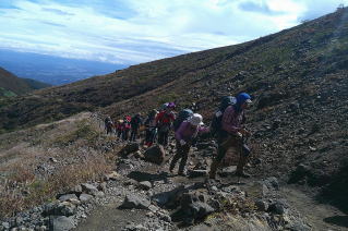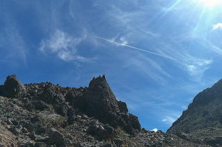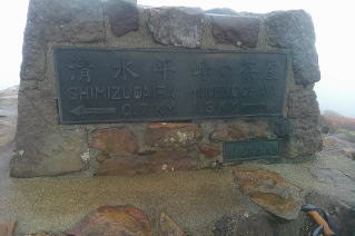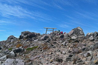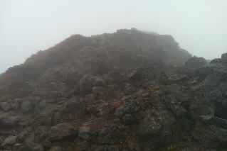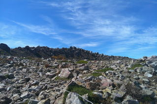 足場の悪い急なガレ場を登って行くと、緩やかな登りになり「那須岳三角点」に到着。ここから茶臼岳山頂は直ぐで山頂の鳥居が観えてくる。