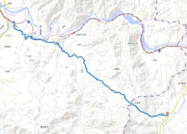 下りは、山形と新潟の県境を越える古道で、玉川側はほぼ送電線に沿ったコースで下る。