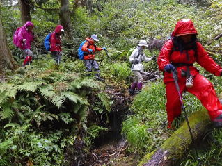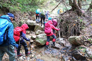 この峠では、沢に沿って街道が作られていたが、2022年8月の豪雨により途中かなりの距離に亘って削られて跡形もない状況で且つ沢が大きく広がって大きな岩で埋め尽くされ、ガイドさんの誘導があって何とか渡れてはいるが、削られた壁をよじ登るなど大変難儀して歩いた。