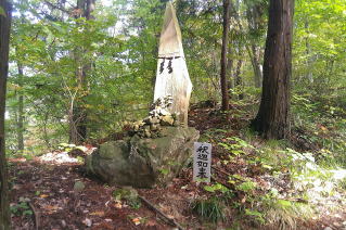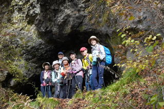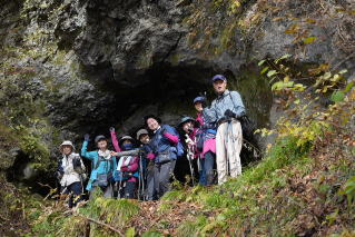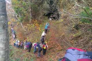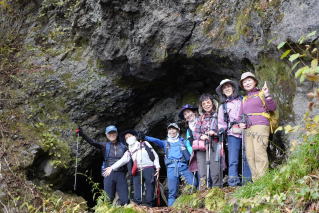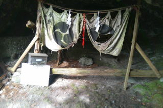 足元には少しでが残雪も観えてきます。やがて左側に大きな岩室が観えてきます。室の奥には御社が祀ってあり、班ごとに登ってお参りをさせてもらいました。