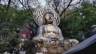 登るとき以上の紅葉を楽しみ下山し、谷厳寺が近付くと木々の間から大きな大仏が幾つも観えてきます。この大仏は十二支毎に祀られており満バー夫々自身の干支大仏に手を合せました。