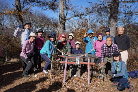 1台が少し遅れたため、予定の24分遅れで登山開始。まず、王城山神社で無事山行が終了しますようにと全員で参拝。