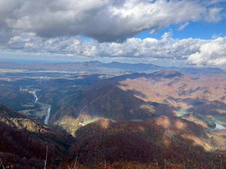 素晴らし景色です。青空、眼下広がるエメラルドグリーンの三面川と三面ダム、山々の紅葉。しばしおやつ&写真タイム。