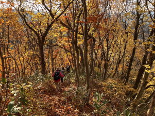 だんだんきつい登りになります。色とりどりの紅葉に励まされて進み、登ります。