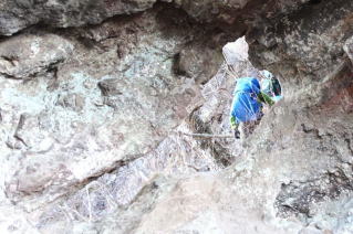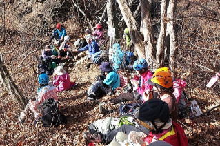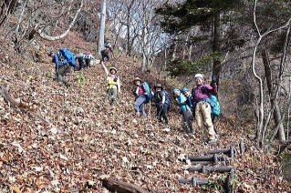 いよいよ、頂上直下の鎖場です。頂上は狭いので、班ごとに交代で登ります。リュックをデポして身軽になり、1人ずつ鎖を握り慎重に登りました。 頂上では、各自の思い思いのポーズで記念写真をとり、360度の大展望を楽しみました。