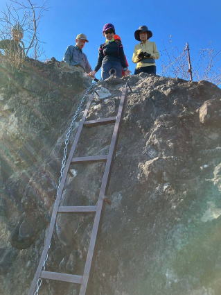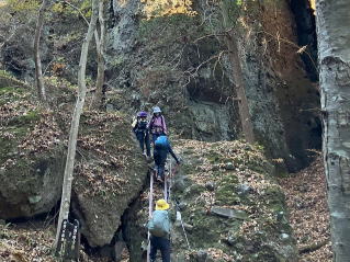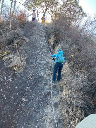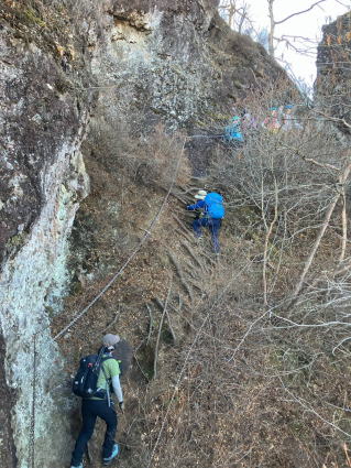 岩場の急登、梯子、チェ-ンを慎重に登る。いつしか熊のことは忘れて山頂直下に着いた。本日のメインを一人一人チェーンを掴み山頂へ。