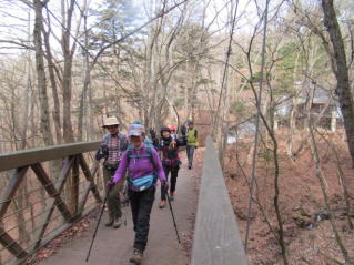 落葉した樹間から豪華な別荘やコテージが見え、旧碓氷峠遊覧歩道に入ると案内板に立ち止まりながら学習を繰り返しました。