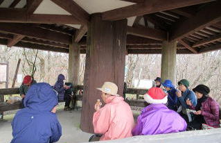 Yさんのハモニカ演奏「いつでも夢を」を聞きながら東屋でランチタイム、メンバーは吉永小百合と橋幸夫になり切ってハミングしました。