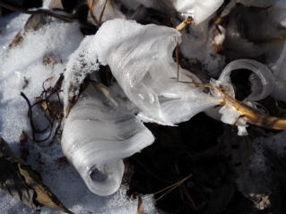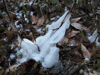 登山口出発、火ノ口林道を進むこと10分。Sリーダーより氷華が観られるかも?との情報で…次々と珍しい氷華を見つける!大小形もさまざまな氷華。