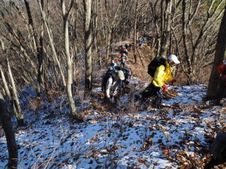 20分程ゆっくり歩行で撮影や観察をしながら楽しみました。次に進むと杉樹林、緩やかで葉の堆積でフカフカ。次は落葉自然樹林帯で薄っすら白い雪と落ち葉を踏み徐々に高度を上げ分岐へ。立派な標識は山頂迄のm表記で2ヶ所程通過し鞍部に出る。落葉樹林の間から真青な空と白の雪山が対照的で美しい。