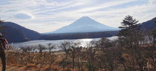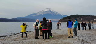 朝食は7時から。朝6時を過ぎると明るくなった。宿の前、山中湖畔の富士の絶景をみんなで見る。まだ東の空に雲が多く、この日は残念ながら赤富士は見えなかった。でも多くのカメラマンがいる浜辺で毎年恒例の富士鑑賞会、たっぷりと富士を味わった。