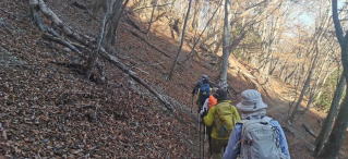 帰りは同じ道を少し下って杉山新道を降りる。道には落ち葉がいっぱい。その落ち葉が積もって柔らかくなった登山道。急斜面をジグザグに降りると住宅地に出る。落合水路橋という水路の下をくぐって県道に出る。ここに旧道の交差点があり中型バスの出入りができる、事前の計画ではここから30分歩いて道の駅まで行く予定だったが、そこにバスに乗るようにしたので30分の節約ができた。そこからコンビニ、そしてトイレ休憩をとり宿に入ったのでした。