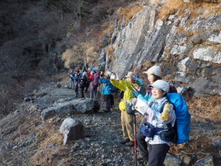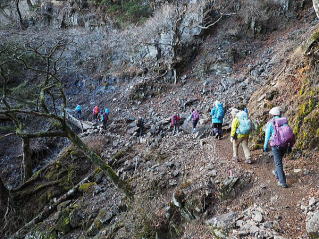 落石に注意しながら歩く |